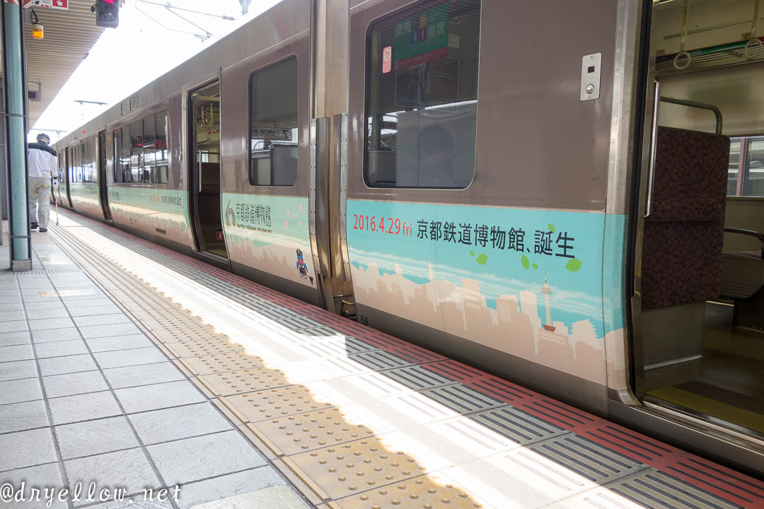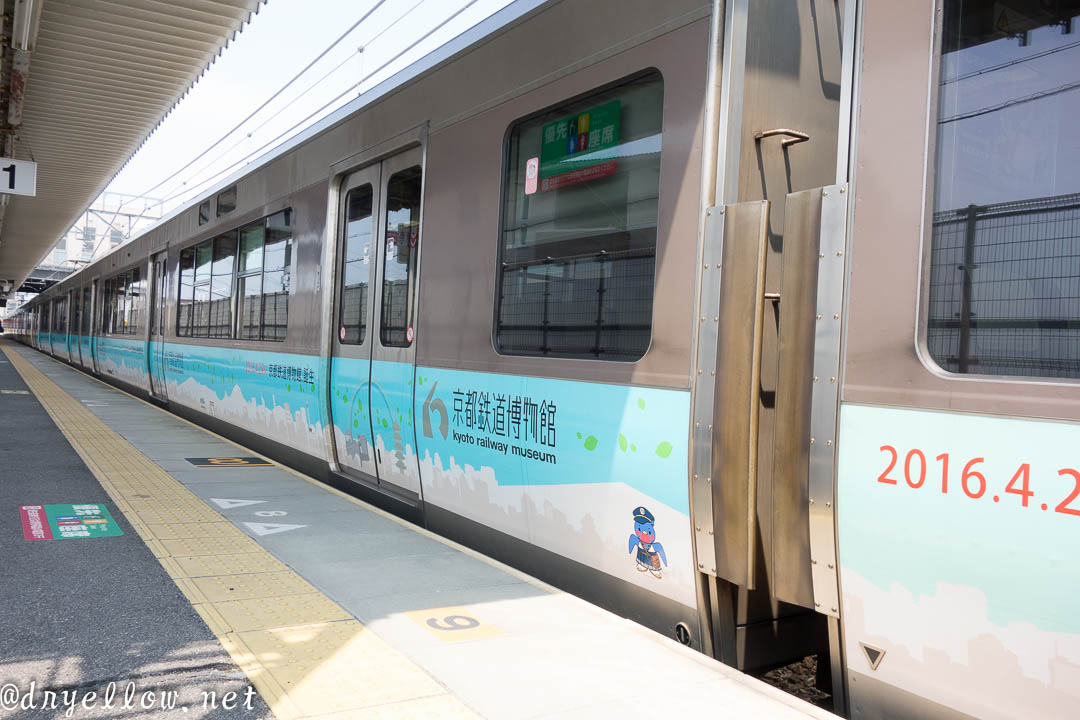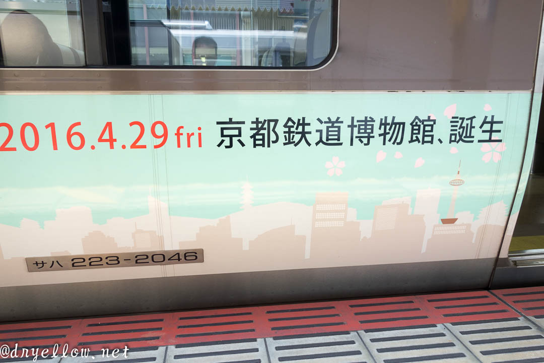 ラッピング電車といっても車両全体にラッピングを施したいかにもラッピングといった感じではなく、控えめに4月29日に京都に鉄道博物館がオープンするからPRでもしておこうか!!といった感じのラッピングです。